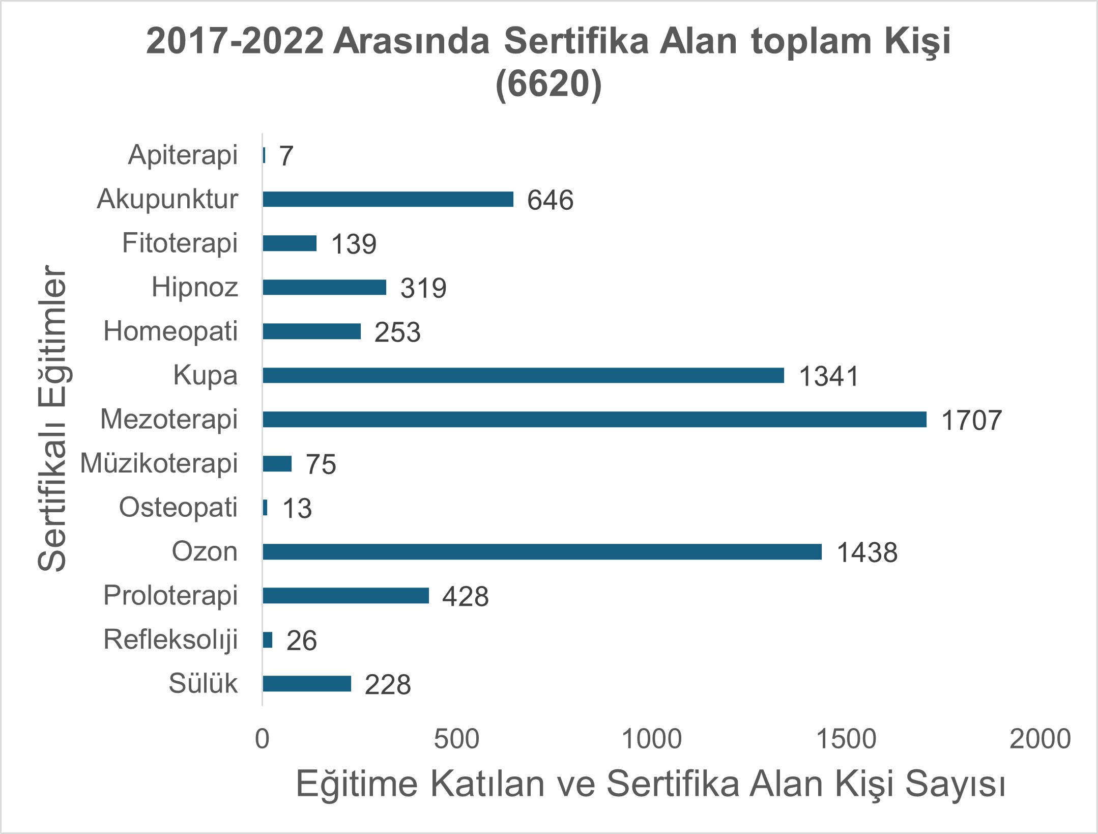 2017–2019 yılları arasında eğitim programları ve eğitimcilerle ilgili bildirimler süresi içinde Sağlık Bakanlığı’na iletilmiş; bu dönemde eğitim ilanları başta İstanbul olmak üzere çeşitli illerde yapılmıştır. Programlar İstanbul (Bağcılar SUAM ve Ümraniye SUAM), Ankara (Keçiören SUAM), Antalya, İzmir (Bozyaka SUAM), Bursa (Bursa Yüksek İhtisas SUAM) ve Kayseri’de duyurulmuştur. Bu çerçevede, 2017–2022 yılları arasında eğitimler yapılmıştır. Merkezimizde bugüne kadar toplam 6620 adet sertifikalı eğitim gerçekleştirilmiş olup, her bir uygulama alanına ilişkin ayrıntılı dağılım aşağıdaki grafikte sunulmuştur.