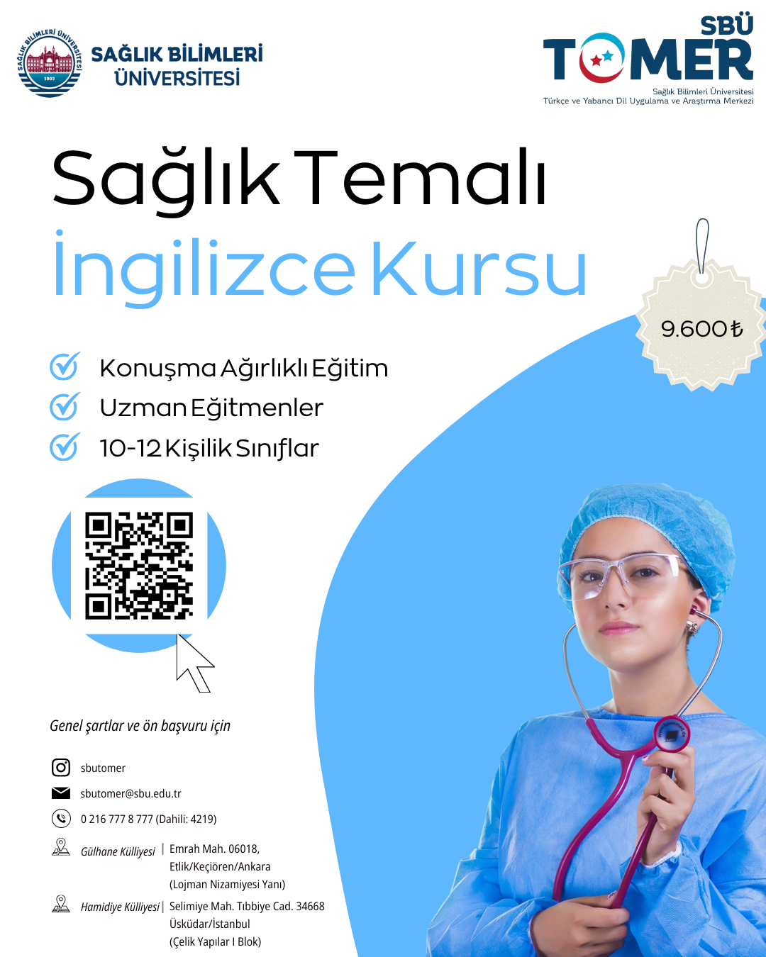 Sağlık Bilimleri Üniversitesi Türkçe ve Yabancı Dil Öğretimi Uygulama ve Araştırma Merkezi (SBÜ-TÖMER) bünyesinde, sağlık profesyonellerine ve öğrencilere özel hazırlanan Sağlık Temalı İngilizce Kursu kayıtları başlamıştır. Mesleki İngilizce becerisini geliştirmeye ve klinik pratikte akıcı iletişim kurmak için tasarlanan bu kurs, uzman eğitmen kadrosu tarafından gerçekleştirilecektir. Konuşma becerisi ağırlıklı olarak planlanan bu kurs için 10-12 kişilik sınıflarda öğretim verilecektir.